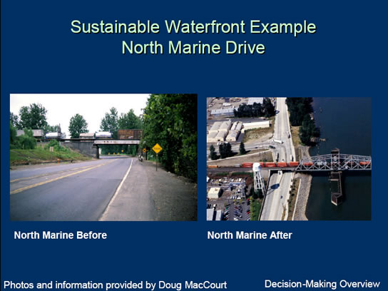 The Federal-aid Highway Program provided $14.6 million of the $25 million cost for completing the North Marine Drive Project, which involved relocating a road through contaminated land to provide access from Interstate 5 to the deepwater terminal. The new road, with additional wider lanes, improves the efficient operation of the port and has made the property more desirable for development. The project also improved access to recreational opportunities at Kelly Point Park at the confluence of the Willamette and Columbia Rivers and protected nearby wetlands from encroachment.