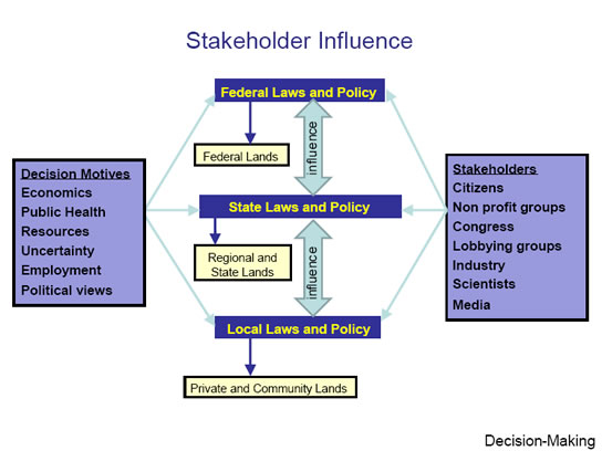 Different groups of stakeholders can also influence decisions. Among these are citizens likely to be affected by a decision, non-profit organizations, Congressional representatives, lobbying groups, industrial groups, scientists or academia, and the media. Different needs or desires motivate each of these groups.