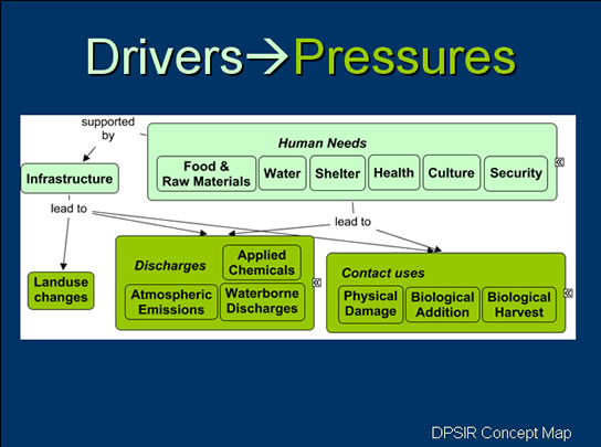 Drivers function through human activities, such as land use changes, discharges, and contact uses, which may intentionally or unintentionally exert Pressures on the environment.