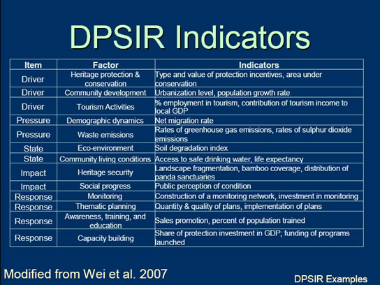 The authors used the DPSIR framework to generate a tentative list of sustainable development indicators which could be used to monitor management activities.