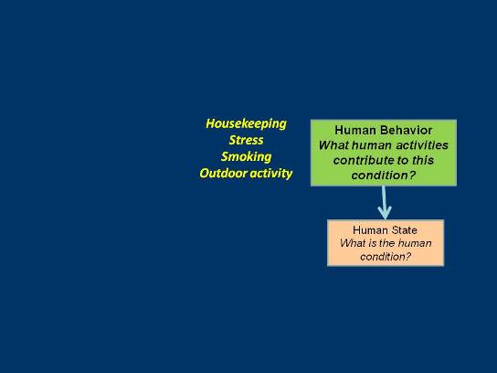 Next we ask, 'What human behaviors might contribute to this condition?' The answers might include housekeeping practices, stress, smoking, and outdoor activities.