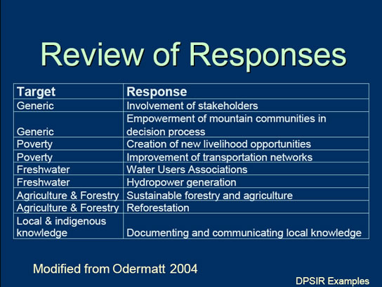 Odermatt, S. 2004. Evaluation of mountain case studies by means of sustainability variables: A DPSIR model as an evaluation tool in the context of the North-South discussion. Mountain Research and Development 24:336-341.