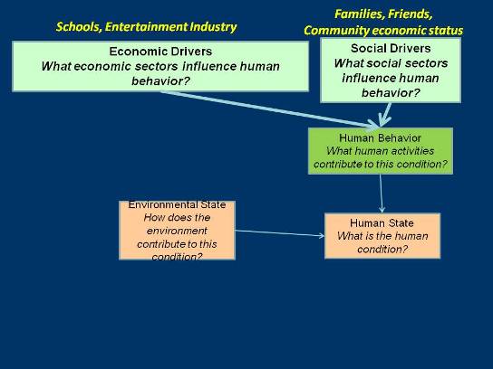 Next we ask, 'What economic sectors or social factors might influence human behavior?' Economic sectors which might influence human behavior include schools or the entertainment industry. Social factors might include family, friends, or community economic status.