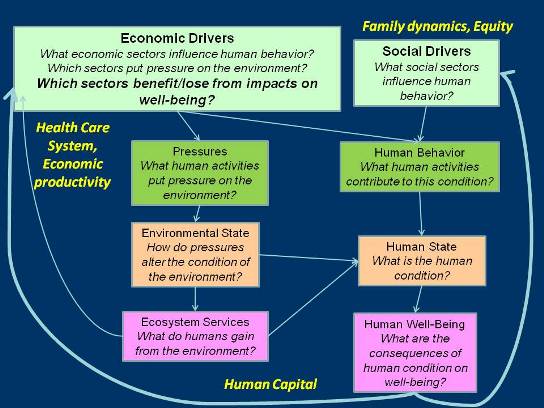 Next we ask, 'What are economic sectors or social drivers might benefit or lose from a change in human well-being?' In this case, controlling asthma is certainly of interest to the health care system, but high rates of asthma, increased medical costs, and decreased worker productivity have potential to have broad economic costs across all sectors. Moreover, individual well-being can influence family dynamics or one�s sense of equity, if certain communities or cultures are more likely to be exposed.