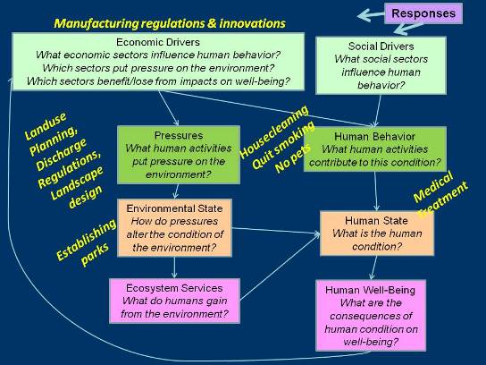 Finally we ask, 'What are decision options are available to address the issue?' By first identifying Drivers, Pressures, State, and Impact, we can identify potential decision options across all levels of the DPSIR. Driver-level responses might include manufacturing regulations or innovations to improve housekeeping or reduce allergens. Pressure-level responses might include landuse planning, implementing air emissions regulations, implementing landscape design practices that reduce pollen. Options to modify human behavior might include improving housecleaning practices, quitting smoking, removing pets from the household. State-level responses might include establishing parks to enhance green spaces, or improving human health directly through medical treatment.