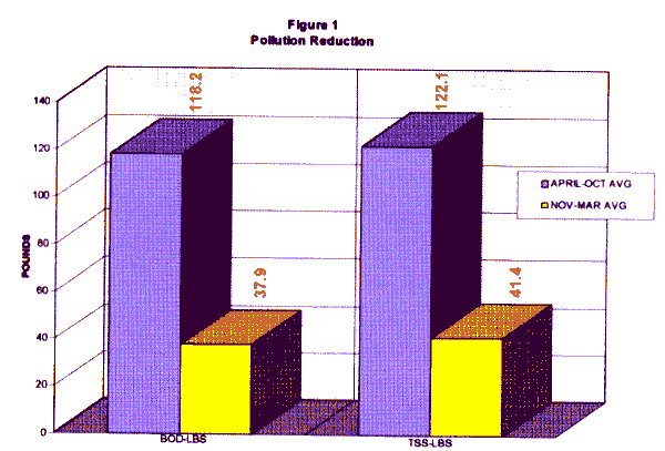- Reduction in pollutant discharge. During the period April 1996 - October 1996, the facility averaged 118 lb/day BOD discharge and 122 lb/day TSS discharge. During November 1996 - March 1997, or as the Pollution Prevention/Water Reuse Project was phased in, BOD discharge fell by 69%, to 37 lb/day, and TSS discharge fell by 67%, or 41 lb/day. On an annual basis, this project will reduce BOD discharge by 31,025 lb, and TSS by 29,565. Although the discharge limits are protective of the Elk River, removal of these pollutants far beyond permit requirements can only further improve stream quality. These reductions are directly related to the project. The combination of less water discharge, together with superior treatment plant performance due to increased retention time, have netted this pollutant discharge reduction.