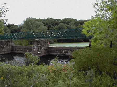In the summer of 2004, a newly constructed bridge spans the Pratt Dam to link the Blackstone River Bikeway from Lincoln to Cumberland, RI. -