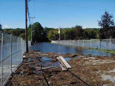 A view of the south access gate to the J. M. Mills Landfill impacted by occasional flooding along the Blackstone River. On these occasions, the river's flow is in direct contact with the west slope of the landfill. (P&W Railroad passes immediately to the east of the landfill). -