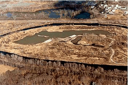 1987 photo (looking east) depicting the manipulation of the Blackstone River by private sand and gravel extraction and landfilling operations at the Un-named Island immediately south of the J.M. Mills Landfill and a part of the OU2 investigation. (Large excavator in operation at center of photo; Blackstone River splits its flow around island; access to island is via the Pratt Dam off photo to the right). -